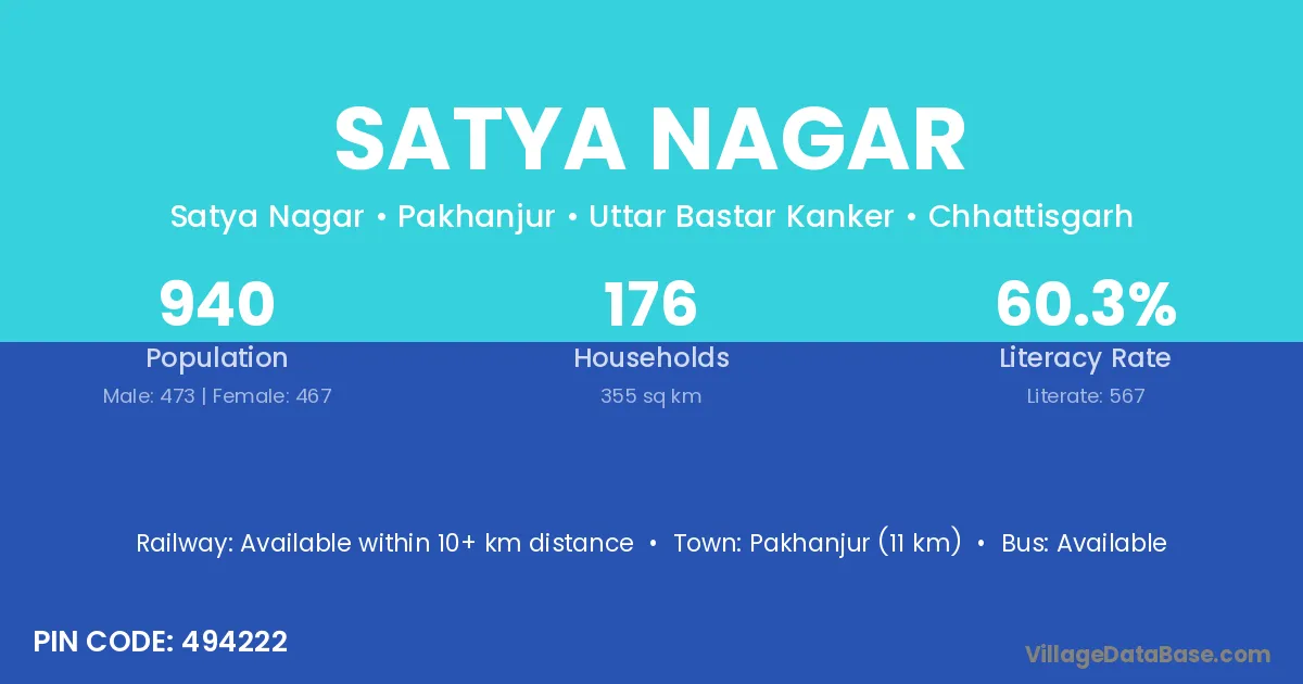 Satya Nagar village has a total population of 940 people, of which 473 are males and 467 are females.