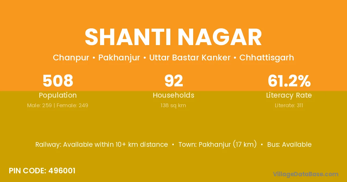 Shanti Nagar village has a total population of 508 people, of which 259 are males and 249 are females.
