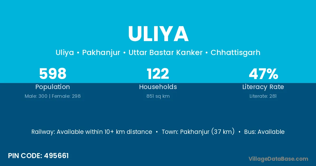Pakhanjur (37 km) is the nearest town to Uliya village for major economic activities and is located approximately 37 km away.