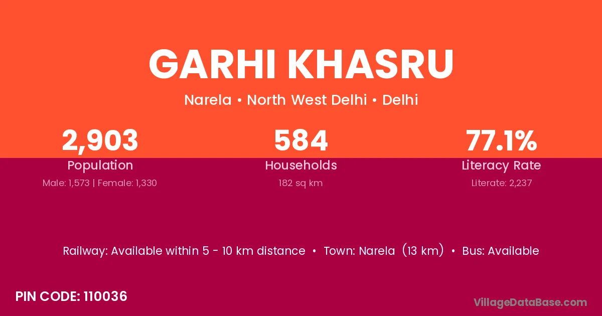 Narela (13 km) is the nearest town to Garhi Khasru village for major economic activities and is located approximately 13 km away.