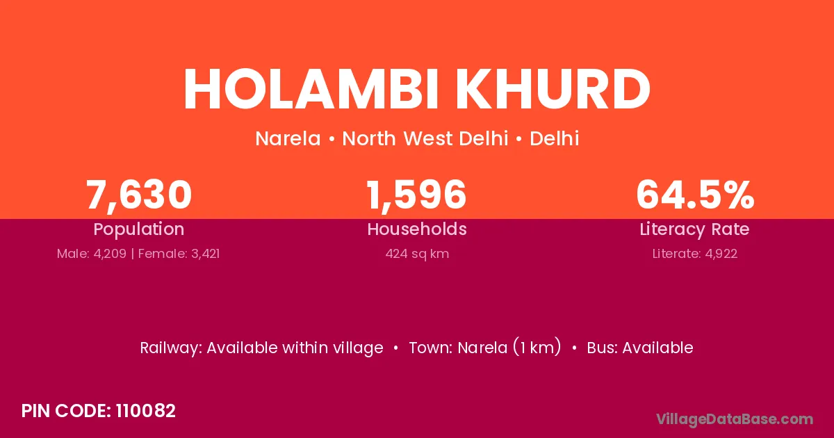 Narela (1 km) is the nearest town to Holambi Khurd village for major economic activities and is located approximately 1 km away.
