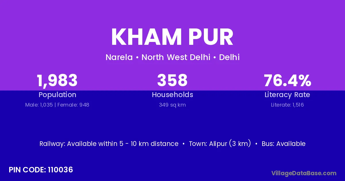 Kham Pur village has a total population of 1,983 people, of which 1,035 are males and 948 are females.
