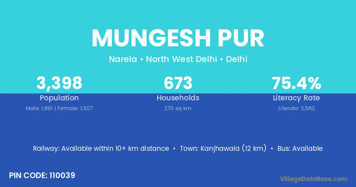 Mungesh Pur village has a total population of 3,398 people, of which 1,891 are males and 1,507 are females.