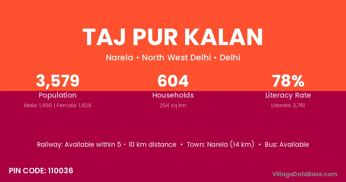 Narela (14 km) is the nearest town to Taj Pur Kalan village for major economic activities and is located approximately 14 km away.