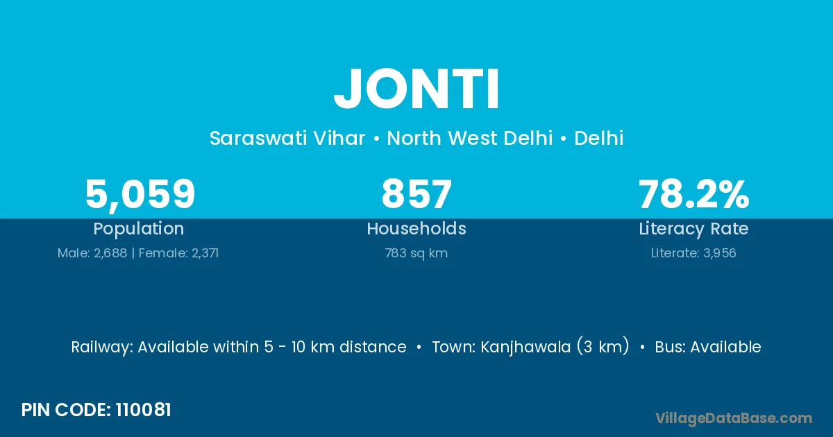 Kanjhawala (3 km) is the nearest town to Jonti village for major economic activities and is located approximately 3 km away.