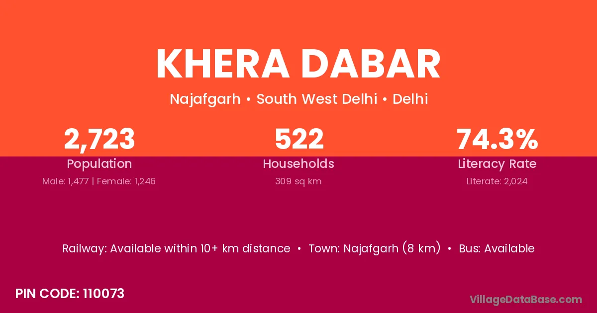 Najafgarh (8 km) is the nearest town to Khera Dabar village for major economic activities and is located approximately 8 km away.