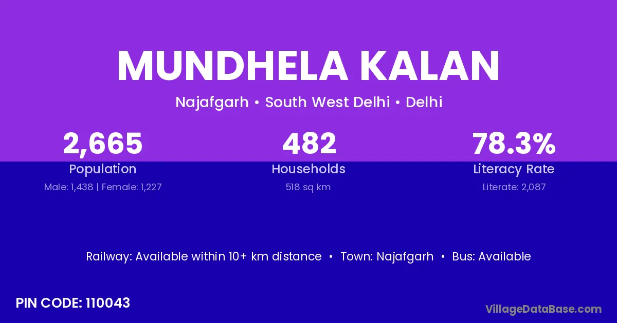 According to Census 2011 information, the village code of Mundhela Kalan village is 110043.