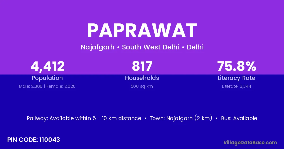 Najafgarh (2 km) is the nearest town to Paprawat village for major economic activities and is located approximately 2 km away.
