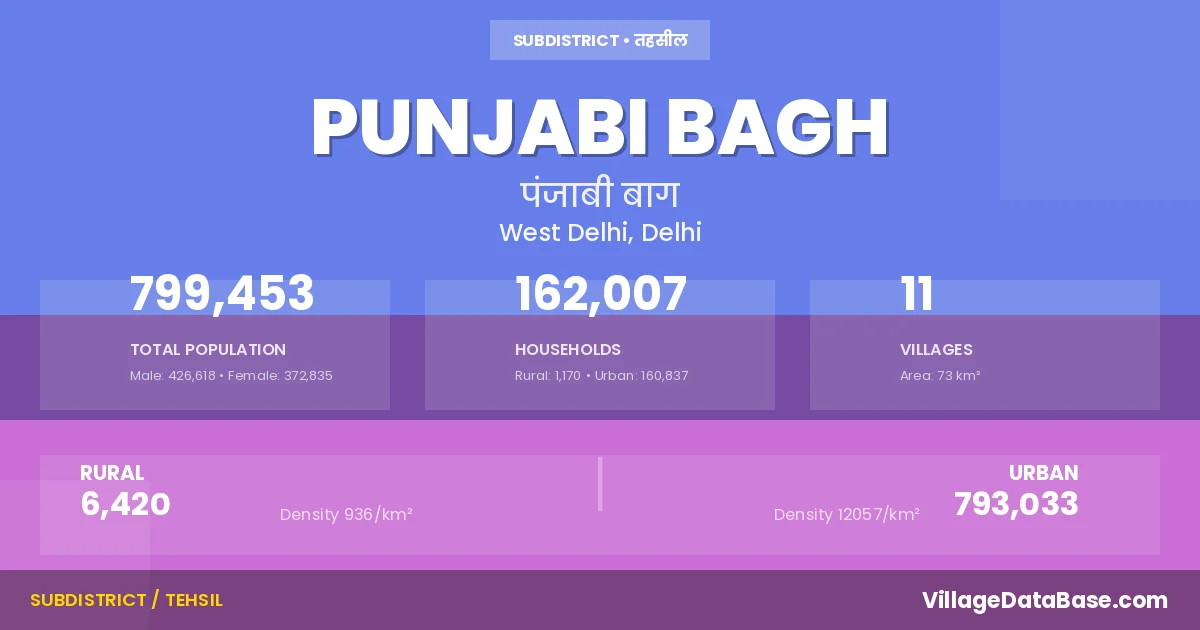 According to the 2011 census The total area of Punjabi Bagh Tehsil is 73 km², with a population of 799453 people. The population density is 11,006 inhabitants per square kilometre, and there are approximately 162007 houses in the sub district.