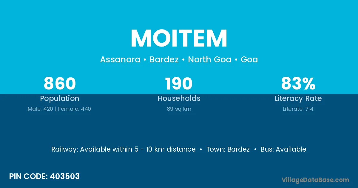 Moitem village has a total population of 860 people, of which 420 are males and 440 are females.
