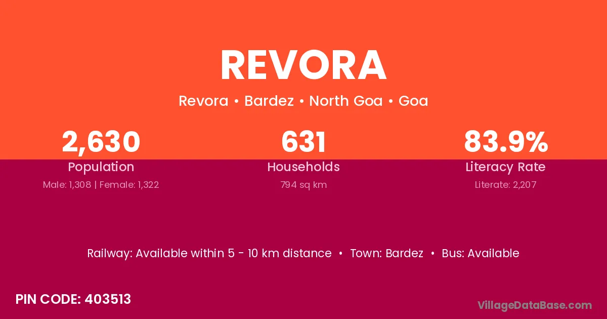 Revora village has a total population of 2,630 people, of which 1,308 are males and 1,322 are females.