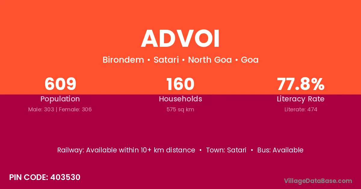 Advoi village has a total population of 609 people, of which 303 are males and 306 are females.