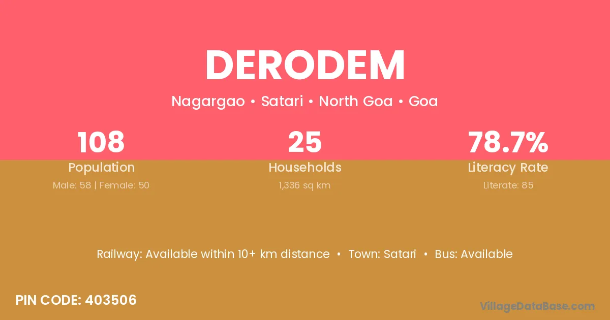 Derodem village has a total population of 108 people, of which 58 are males and 50 are females.
