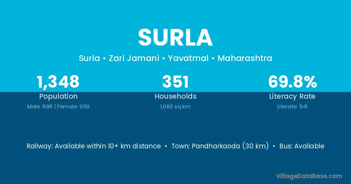 The literacy rate of Surla village is 74.57%. Male literacy stands at 86.28% and female literacy at 63.25%.