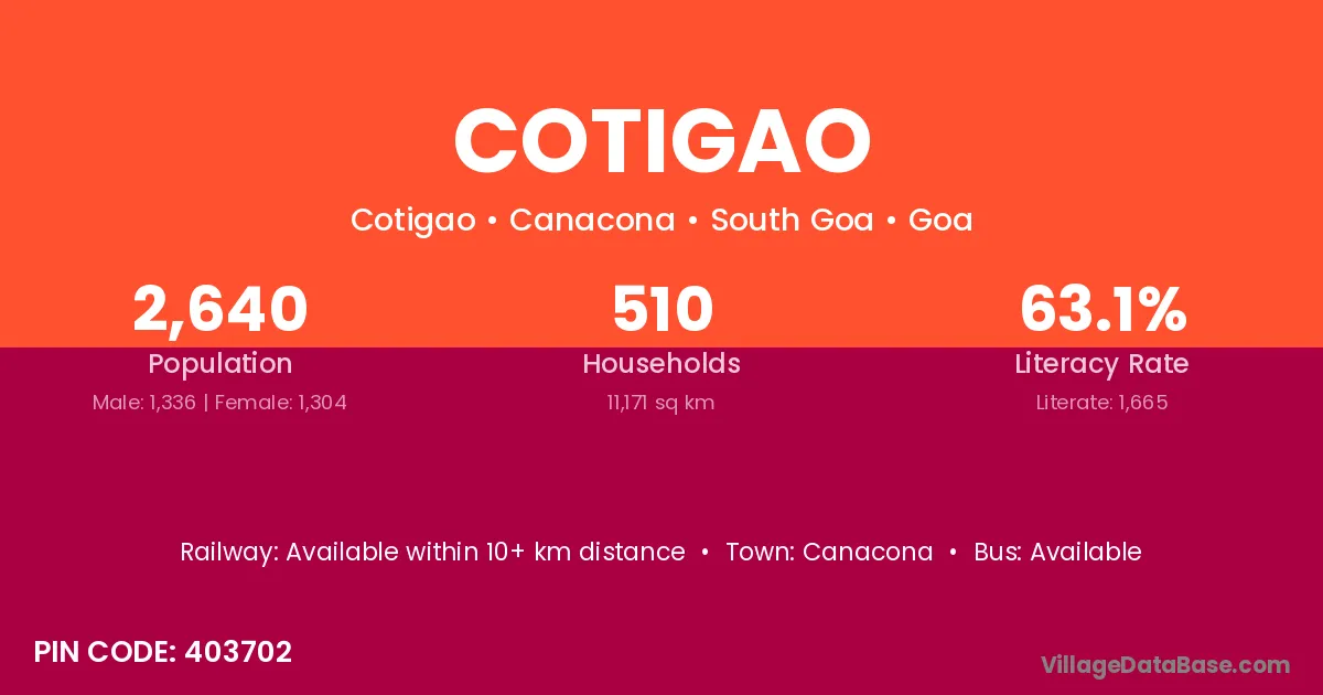 Cotigao village has a total population of 2,640 people, of which 1,336 are males and 1,304 are females.