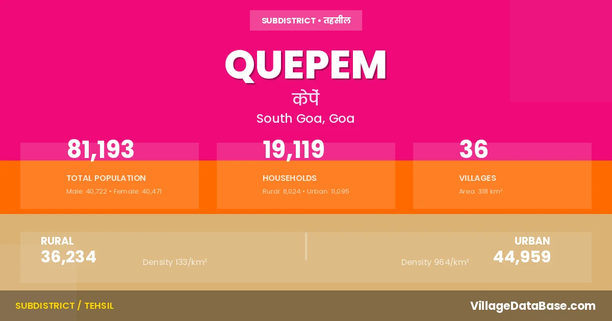 According to the 2011 census The total area of Quepem Taluka is 318 km², with a population of 81193 people. The population density is 255 inhabitants per square kilometre, and there are approximately 19119 houses in the sub district.
