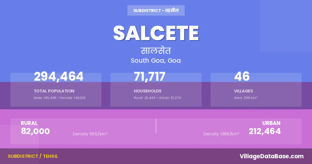 According to the 2011 census The total area of Salcete Taluka is 298 km², with a population of 294464 people. The population density is 988 inhabitants per square kilometre, and there are approximately 71717 houses in the sub district.