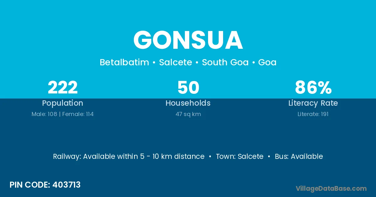 Gonsua village has a total population of 222 people, of which 108 are males and 114 are females.