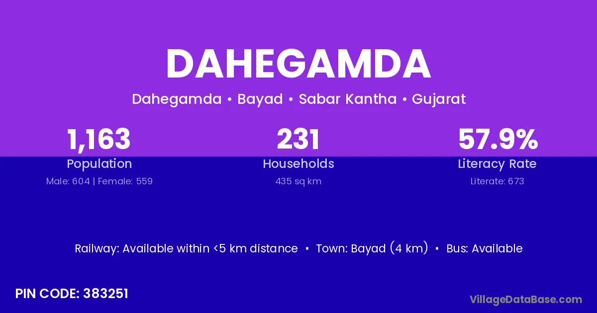 Bavla (13 km) is the nearest town to Dahegamda village for major economic activities and is located approximately 13 km away.