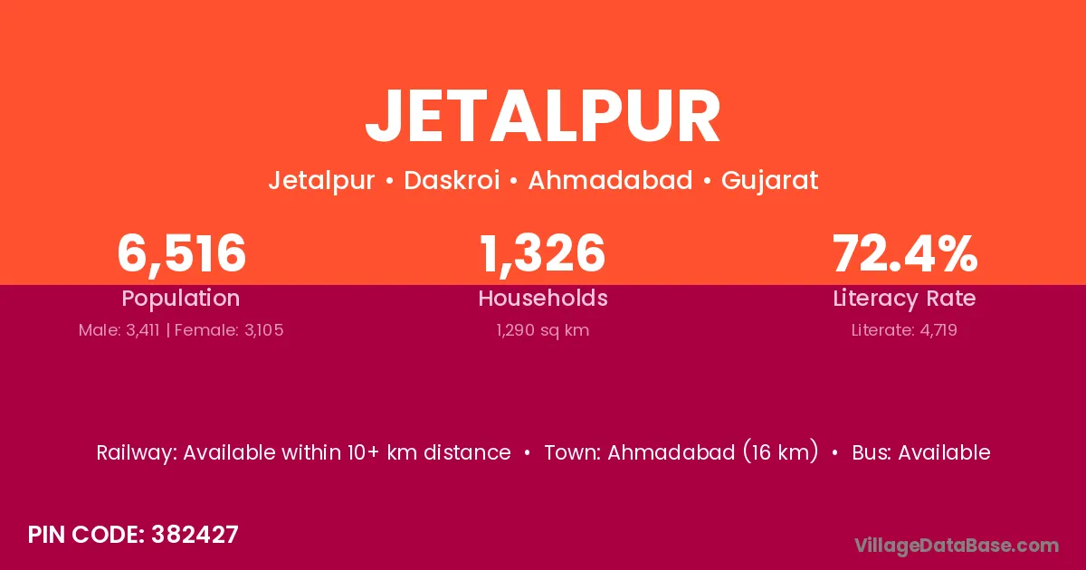 Ahmadabad (16 km) is the nearest town to Jetalpur village for major economic activities and is located approximately 16 km away.