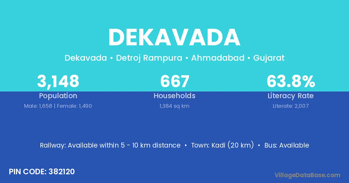 Kadi (20 km) is the nearest town to Dekavada village for major economic activities and is located approximately 20 km away.