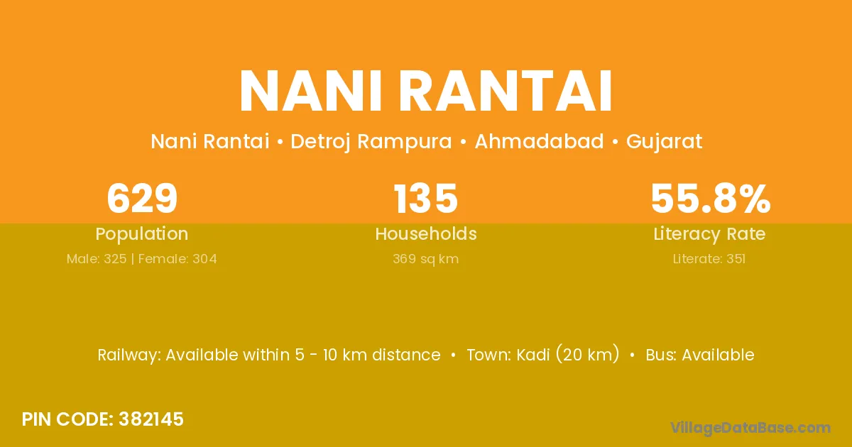 Kadi (20 km) is the nearest town to Nani Rantai village for major economic activities and is located approximately 20 km away.