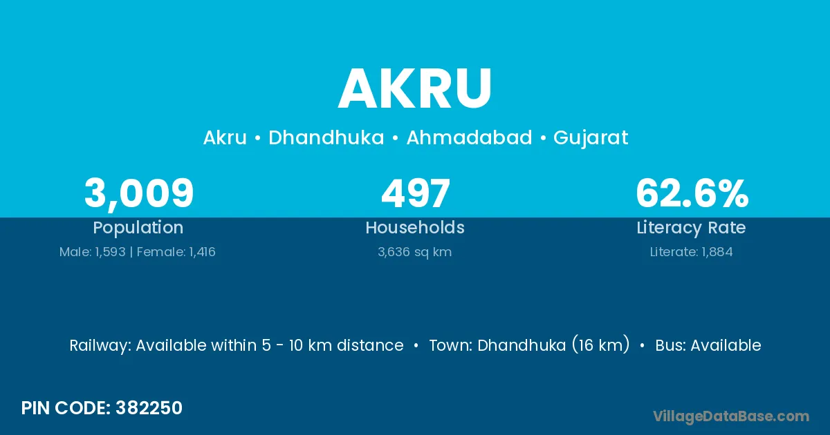 Dhandhuka (16 km) is the nearest town to Akru village for major economic activities and is located approximately 16 km away.