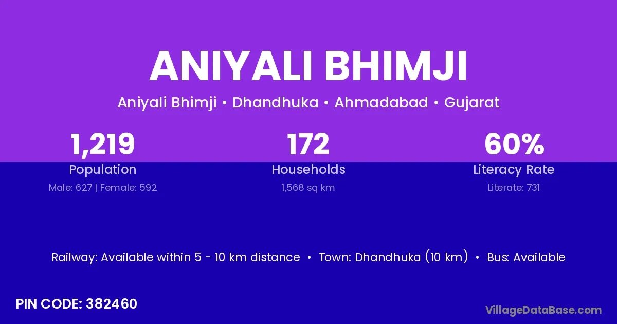 Dhandhuka (10 km) is the nearest town to Aniyali Bhimji village for major economic activities and is located approximately 10 km away.