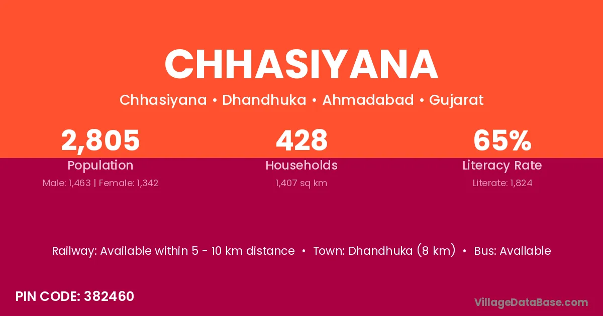 Dhandhuka (8 km) is the nearest town to Chhasiyana village for major economic activities and is located approximately 8 km away.