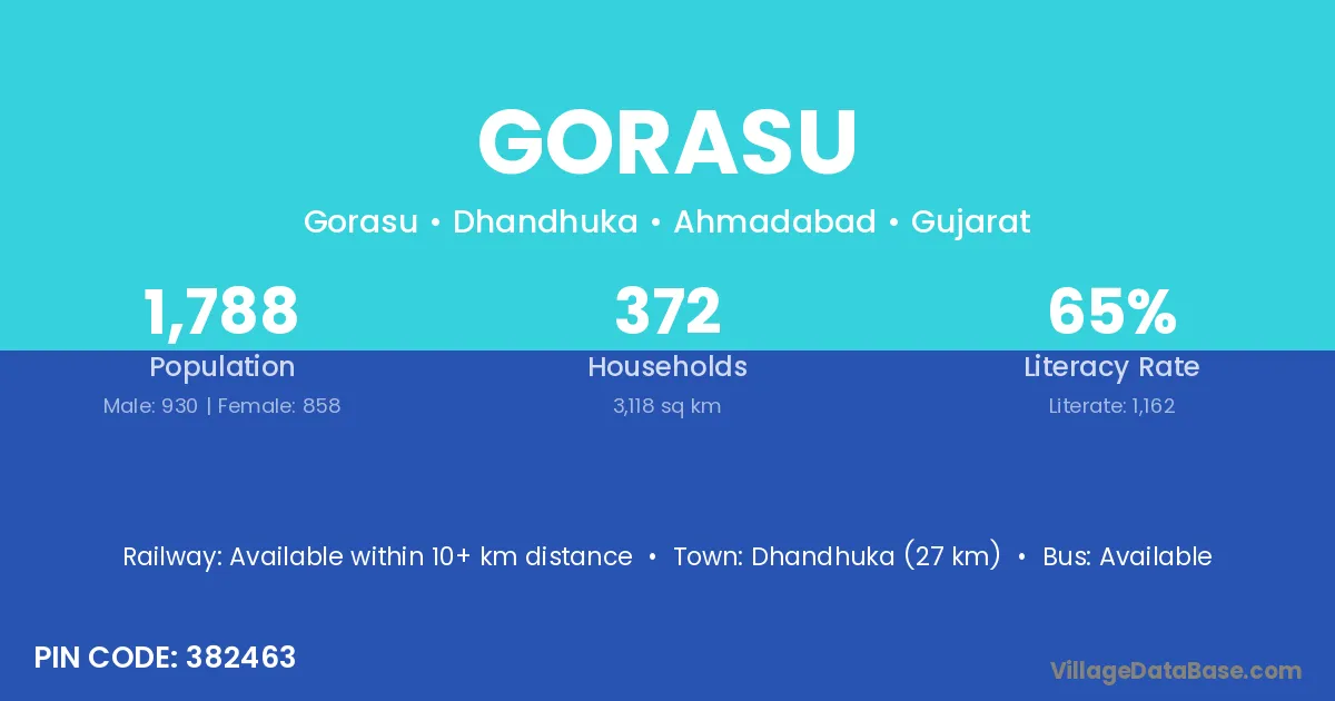 Dhandhuka (27 km) is the nearest town to Gorasu village for major economic activities and is located approximately 27 km away.