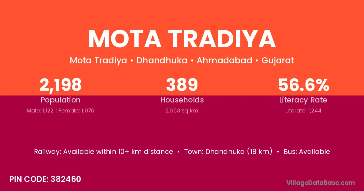 Dhandhuka (18 km) is the nearest town to Mota Tradiya village for major economic activities and is located approximately 18 km away.