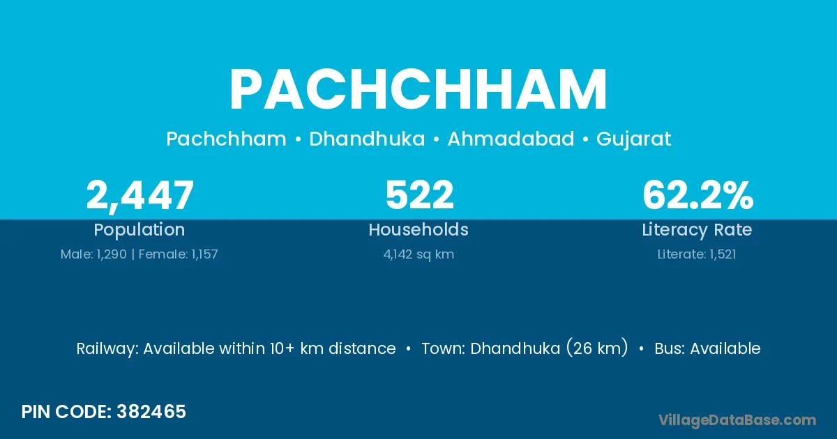 Dhandhuka (26 km) is the nearest town to Pachchham village for major economic activities and is located approximately 26 km away.