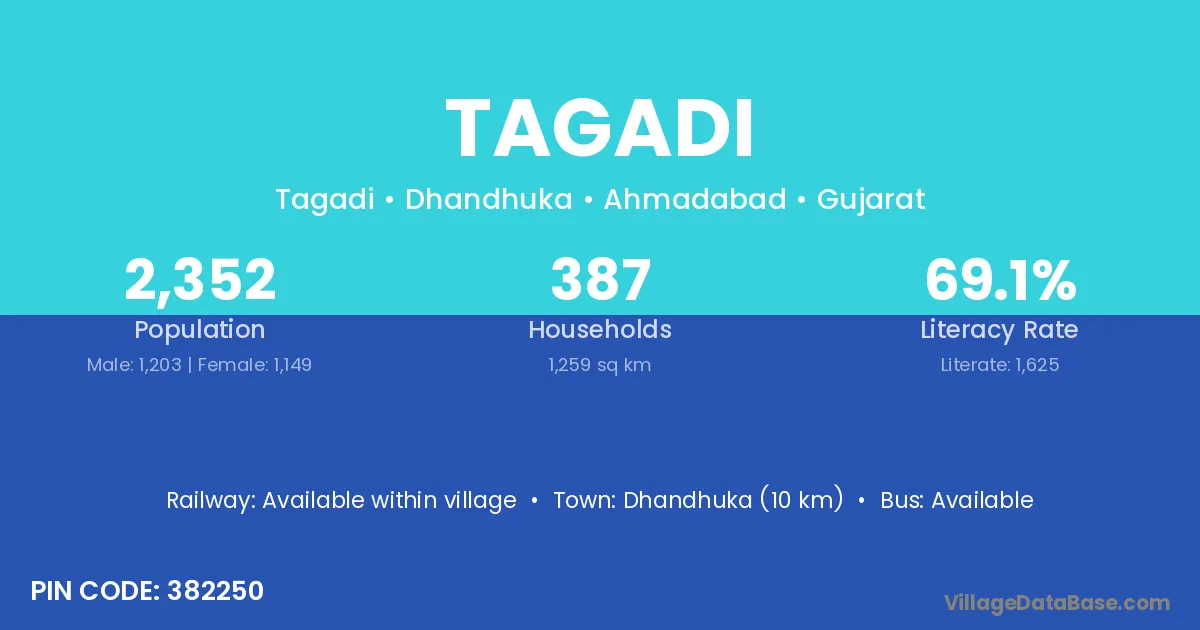 Dhandhuka (10 km) is the nearest town to Tagadi village for major economic activities and is located approximately 10 km away.