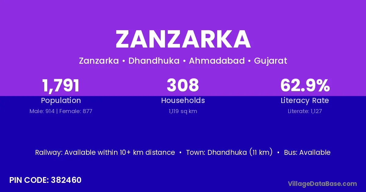 Dhandhuka (11 km) is the nearest town to Zanzarka village for major economic activities and is located approximately 11 km away.