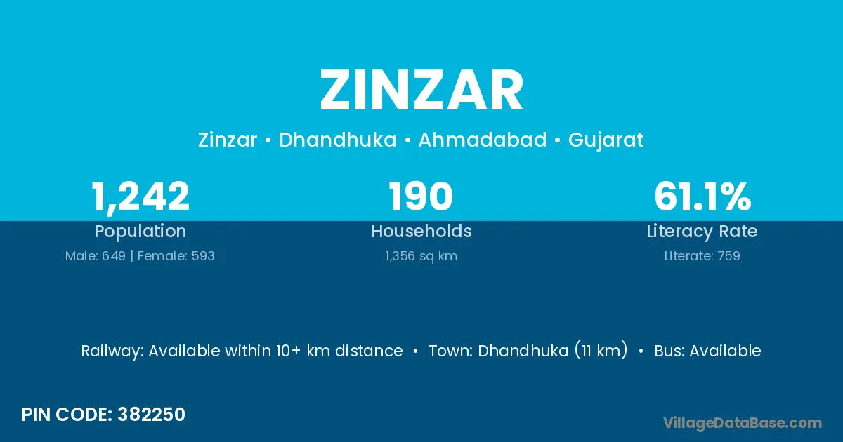 Dhandhuka (11 km) is the nearest town to Zinzar village for major economic activities and is located approximately 11 km away.