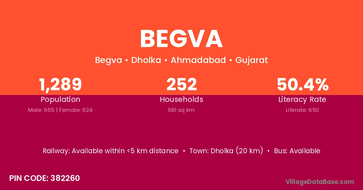 Dholka (20 km) is the nearest town to Begva village for major economic activities and is located approximately 20 km away.