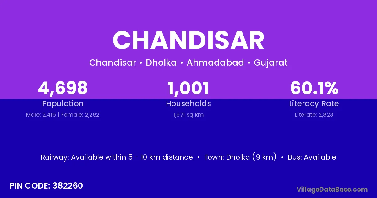 Dholka (9 km) is the nearest town to Chandisar village for major economic activities and is located approximately 9 km away.