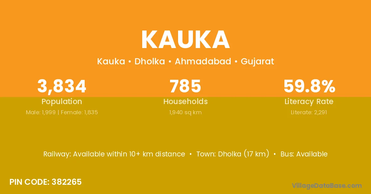 Dholka (17 km) is the nearest town to Kauka village for major economic activities and is located approximately 17 km away.