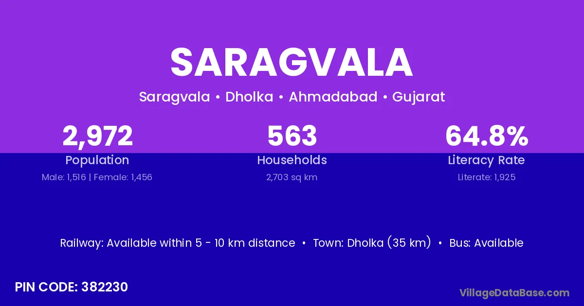 Dholka (35 km) is the nearest town to Saragvala village for major economic activities and is located approximately 35 km away.