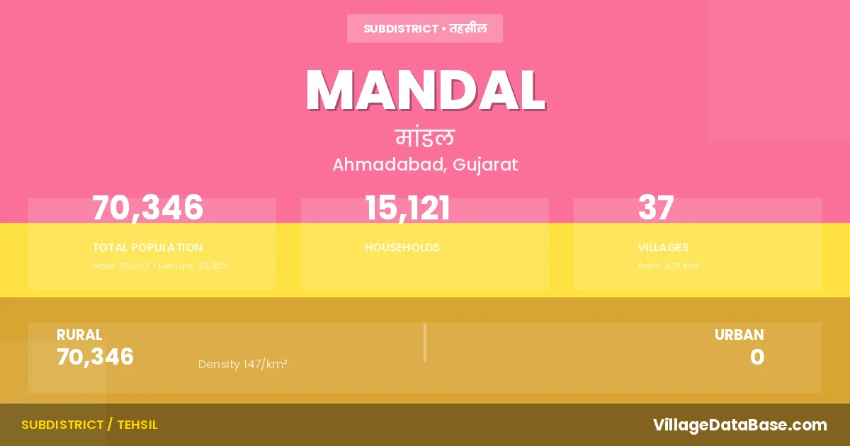 Mandal is a town and Taluka in the Ahmadabad district of the Gujarat. In India, a Taluka is a subdivision of a district responsible for the administration and revenue collection of a specific area within the district. Talukas play a crucial role in the local governance structure, contributing significantly to the development and administration of their communities.