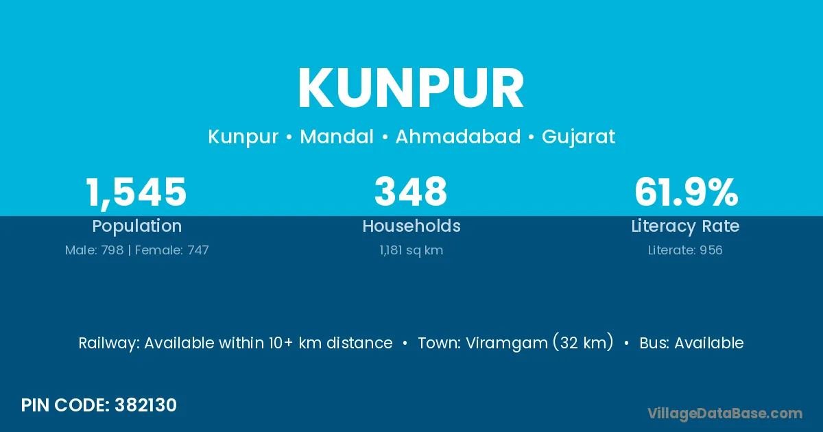 Viramgam (32 km) is the nearest town to Kunpur village for major economic activities and is located approximately 32 km away.