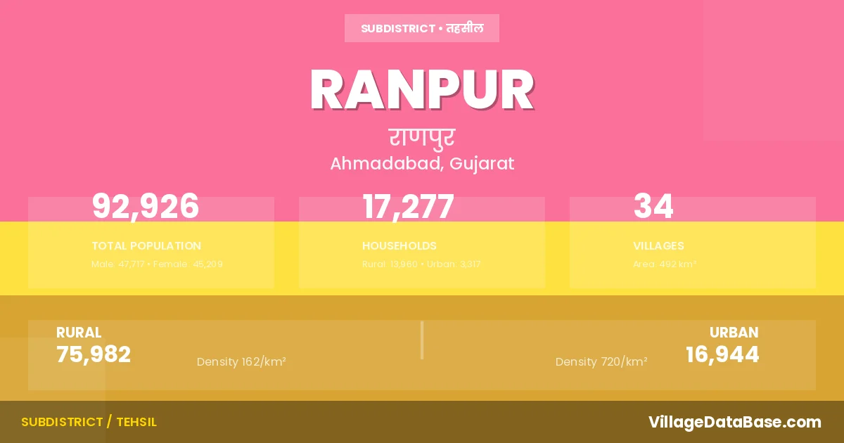 According to the 2011 census The total area of Ranpur Taluka is 492 km², with a population of 92926 people. The population density is 189 inhabitants per square kilometre, and there are approximately 17277 houses in the sub district.