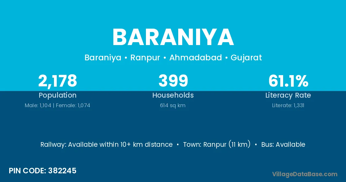According to Census 2011 information, the village code of Baraniya village is 382245.