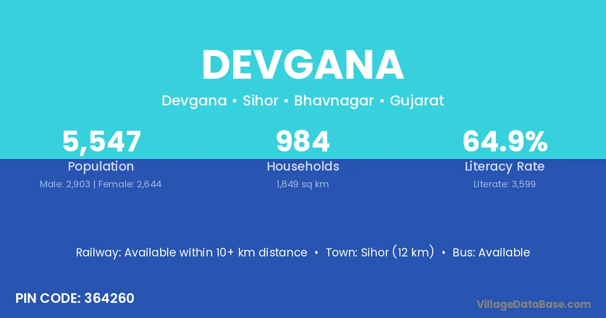The literacy rate of Devgana village is 67.54%. Male literacy stands at 73.22% and female literacy at 61.95%.