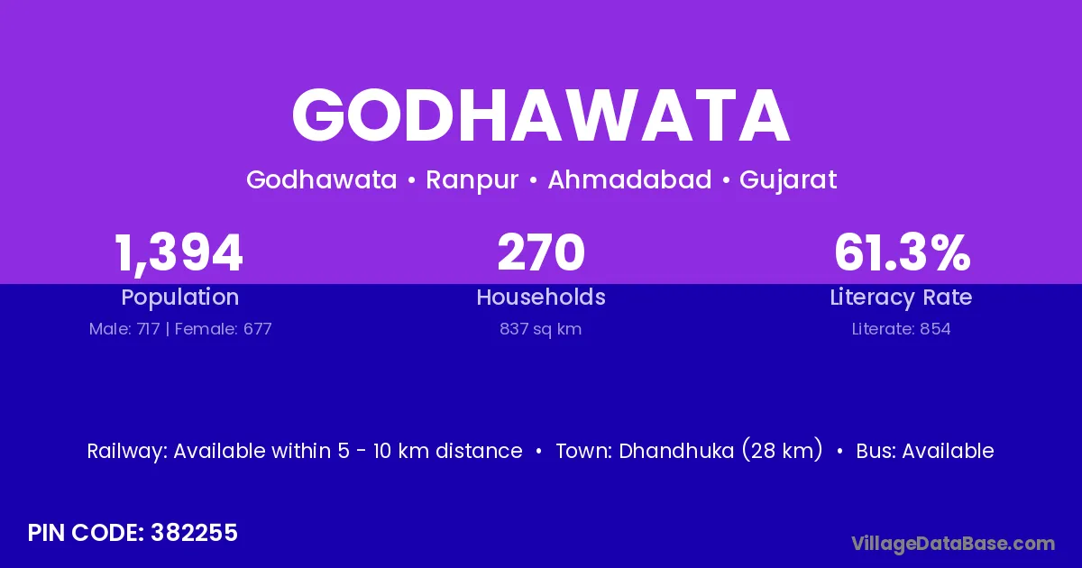 Dhandhuka (28 km) is the nearest town to Godhawata village for major economic activities and is located approximately 28 km away.