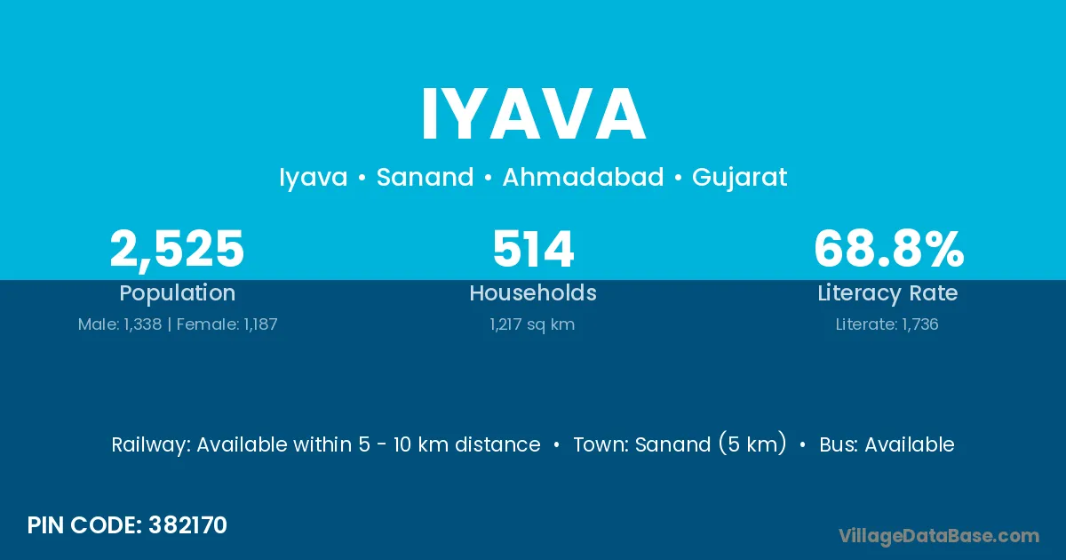 Sanand (5 km) is the nearest town to Iyava village for major economic activities and is located approximately 5 km away.