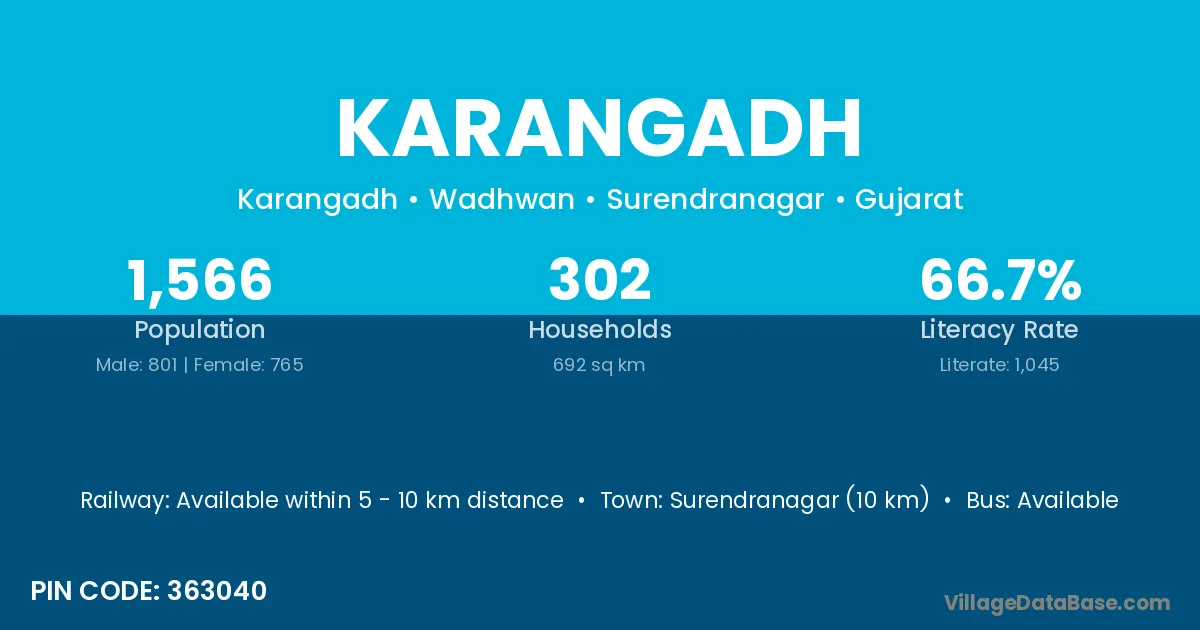 Viramgam (42 km) is the nearest town to Karangadh village for major economic activities and is located approximately 42 km away.