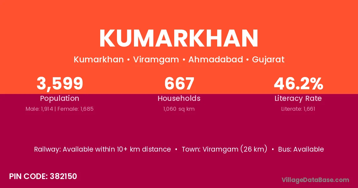 Viramgam (26 km) is the nearest town to Kumarkhan village for major economic activities and is located approximately 26 km away.