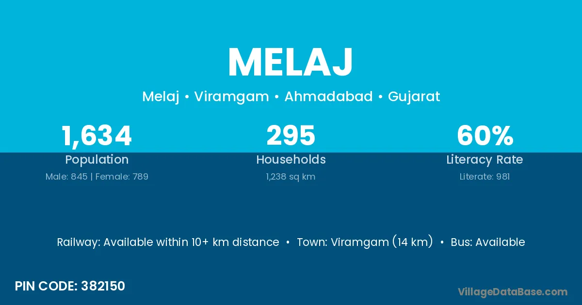 Viramgam (14 km) is the nearest town to Melaj village for major economic activities and is located approximately 14 km away.