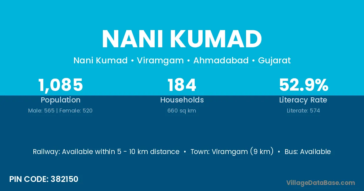 Viramgam (9 km) is the nearest town to Nani Kumad village for major economic activities and is located approximately 9 km away.
